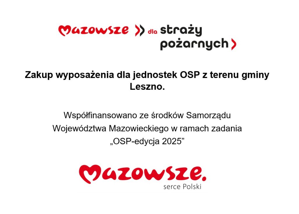 2 czerwca 2025 r. Wójt Gminy Leszno podpisał umowę Nr W/UMWM-UU/UM/OR/1817/2025 o udzieleniu wsparcia finansowego w wysokości 47 800 zł z budżetu Województwa Mazowieckiego. Środki te zostały przyznane w ramach Programu „Mazowsze dla straży pożarnych 2025”. Pozyskane dofinansowanie zostanie przeznaczone na realizację zadania pn. „OSP – edycja 2025”, obejmującego zakup wyposażenia dla jednostek Ochotniczych Straży Pożarnych w Zaborowie, Lesznie, Czarnowie i Gawartowej Woli.