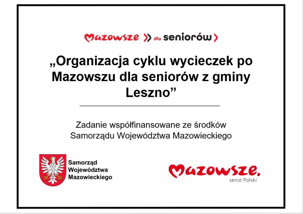 „Zadanie pn: „Organizacja cyklu wycieczek po Mazowszu dla seniorów z gminy Leszno” Współfinansowano ze środków Samorządu Województwa Mazowieckiego”